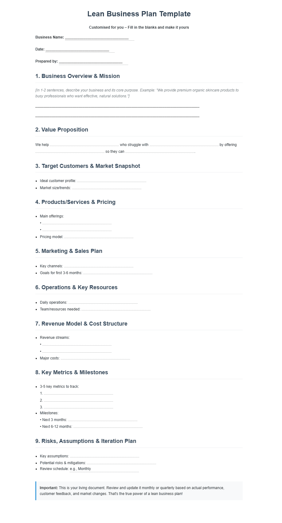 Can I use a lean business plan to apply for funding? Whilst lean business plans work excellently for internal management, most traditional lenders and investors expect more comprehensive documentation. However, your lean plan provides a solid foundation that you can expand with additional financial projections, market research, and formal formatting when seeking external funding.